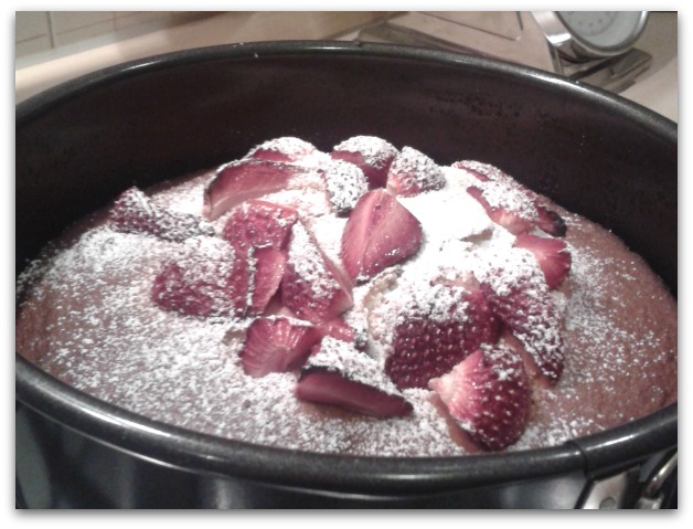 Ho seguito le istruzioni sulla confezione, ma si può usare la ricetta di una torta base normale; a metà cottura ho aggiunto sopra 200 g circa di fragole tagliate a pezzi, spingendo leggermente per farle attaccare all'impasto senza farle sprofondare e ho aspettato la fine della cottura (40 min. a 180°). Una spolvera di zucchero a velo ancora a caldo e la merenda per il giorno dopo era pronta.